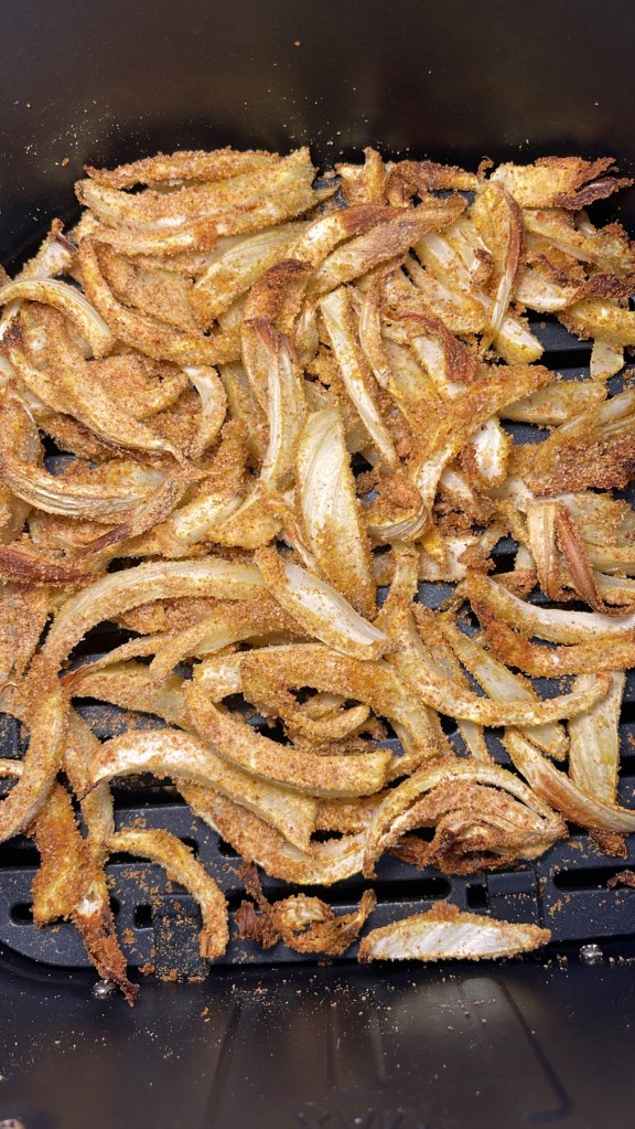 Passa le fette di finocchio nel pangrattato aromatizzato e sistemale nel cestello della friggitrice ad aria, bagna con mezzo cucchiaino di olio e cuoci per 10 minuti a 180 gradi, dopo cinque minuti controlla se è necessario girarli per uniformare la cottura.